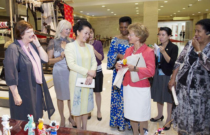 Durante su visita al Museo de Nanjing, Peng Liyuan (tercera a la derecha), junto a las esposas de los líderes extranjeros que asistieron a la ceremonia de apertura de los Juegos Olímpicos de la Juventud 2014, en Nanjing, capital de la oriental provincia de Jiangsu, 16 de Agosto de 2014. [Foto/Xinhua]