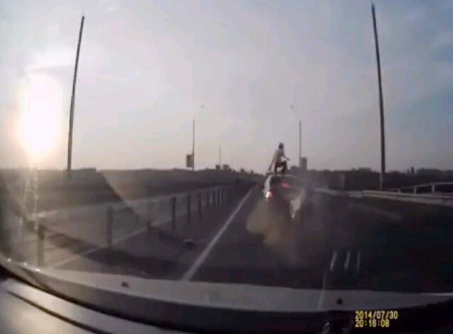 Koroleva, 22/08/2014(El Pueblo en Línea)-Un motociclista a alta velocidad chocó con un auto y de una manera increíble, pudo caer de pie en el techo del auto, que aún estaba en movimiento.