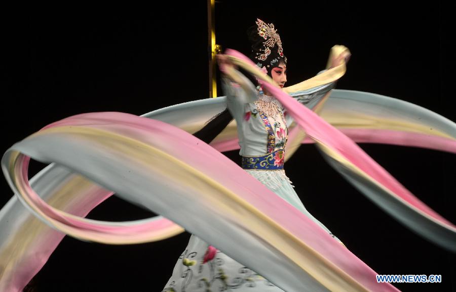 La actriz Dou Xiaoxuan (al centro) en "La Diosa del Cielo regala flores" en el Lincoln Center de Nueva York, Estados Unidos. El homenaje al 120 aniversario del natalicio de Mei Lanfang fue dirigido por su hijo Mei Baojiu. Mei Lanfang nació en 1894. Cantante y director de ópera tradicional china. Su carrera se desarrolló en la época de oro de la ópera de Pekín. 20 de agosto de 2014.