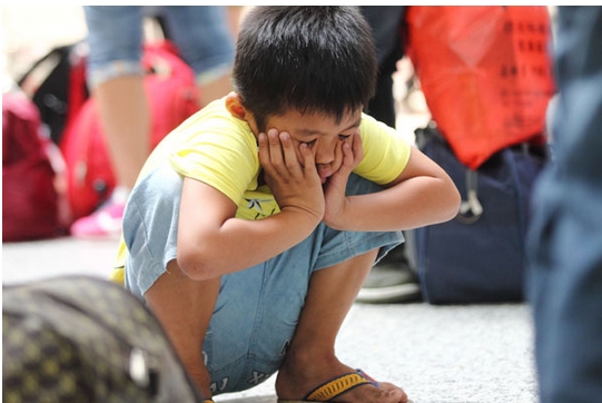 Una ni?o que no quiere separarse de sus padres. [Foto: Xu Kangping / Asianewsphoto]