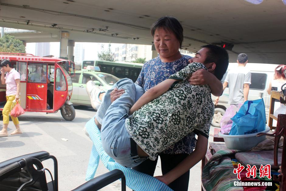 Lu Aimei sostiene a su hijo y le ayuda a salir del triciclo, y prepara el lugar donde cantarán. (Foto: Ma Yiheng)