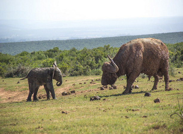 Un elefante bebé pelea con un búfalo (2)
