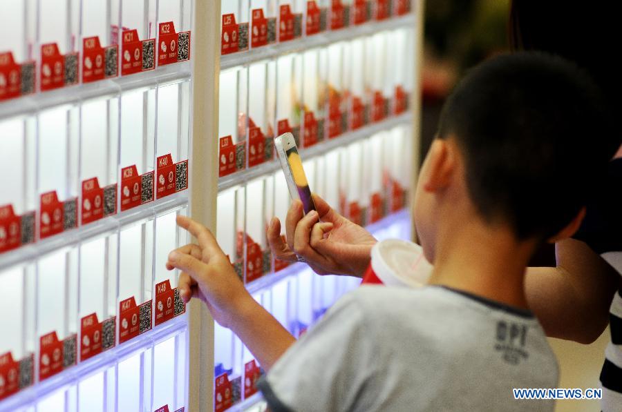 Los clientes utilizan códigos QR para pagar sus facturas en un supermercado automatizado en Qingdao, Shandong. El supermercado automatizado utiliza máquinas expendedoras que aceptan pagos mediante billetes de banco, monedas o (QR) códigos rápidos de respuesta para la gestión del pago en línea.