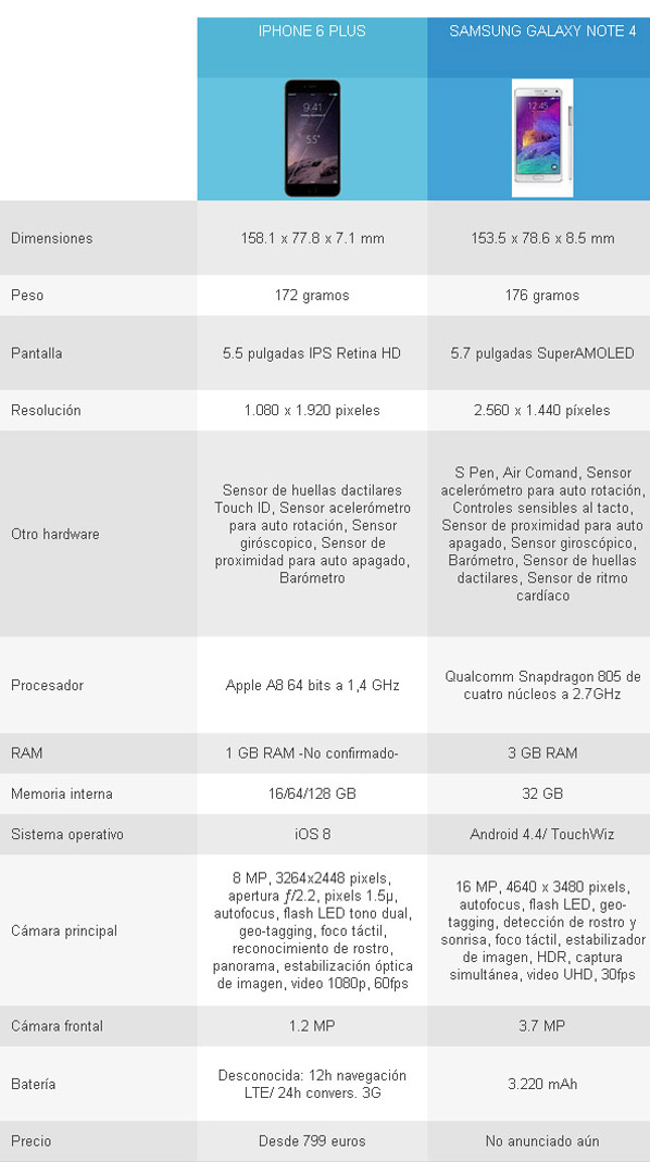 El resto de características por el momento no podemos compararlas ya que se desconocen datos de una u otra parte. Así por ejemplo, Apple no ha informado de la memoria RAM que equipará su teléfono ni la capacidad de su batería, mientras que Samsung tampoco ha anunciado aún el precio de su terminal. Por ello, a modo de conclusión se puede apuntar que hasta que no estén ambos terminales en el mercado no se podrá conocer a fondo el rendimiento de ambos. Y es que a priori, aunque el terminal de Samsung parece estar considerablemente por encima en cuanto a especificaciones, esto importa poco cuando se trata de Apple quien destaca por exprimir sus dispositivos ofreciendo una experiencia de usuario sobresaliente. Eso sí, lo que no hay duda alguna es que el Note 4 pese a ser la cuarta generación de una misma idea, es un terminal mucho más innovador que el iPhone 6 Plus.