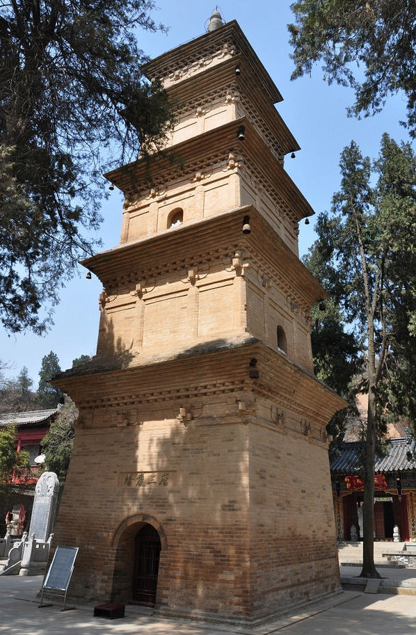 La pagoda del templo Xingjiao, de ladrillo y con cinco pisos, mide cerca de 21 metros de altura, y solo su planta baja tiene mide 5,2 metros. En el lado sur de la planta baja hay una escultura de arcilla de Xuanzang. Desde el cuarto a?o de la era Kaicheng (839 d.C), el monumento alberga inscripciones sobre la vida, el peregrinaje y el proceso de traducción de las escrituras del famoso monje Xuanzang.