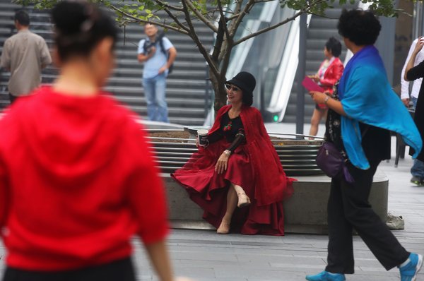 Chen bebe café en una plaza en la zona de Sanlitun de Pekín, el lunes. [Foto/CFP]