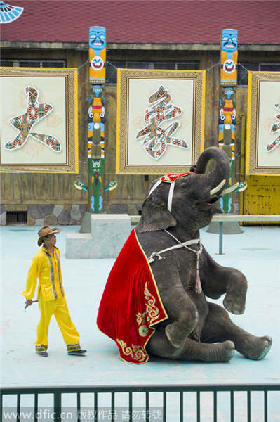 Un domador ense?a a un elefante a sentarse utilizando el cuerno de un toro, en un zoológico de Changsha. [Foto/IC]