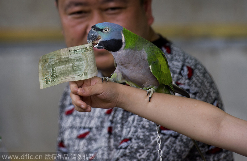 Los visitantes ponen un billete de un yuan en la boca de un loro, en un zoológico de Changsha, el 20 de julio de 2013. [Foto/IC]