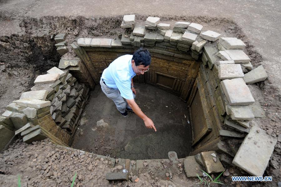Un arqueólogo labora en una tumba de ladrillos en Shengwan, provincia de Henan. [Foto/Xinhua]