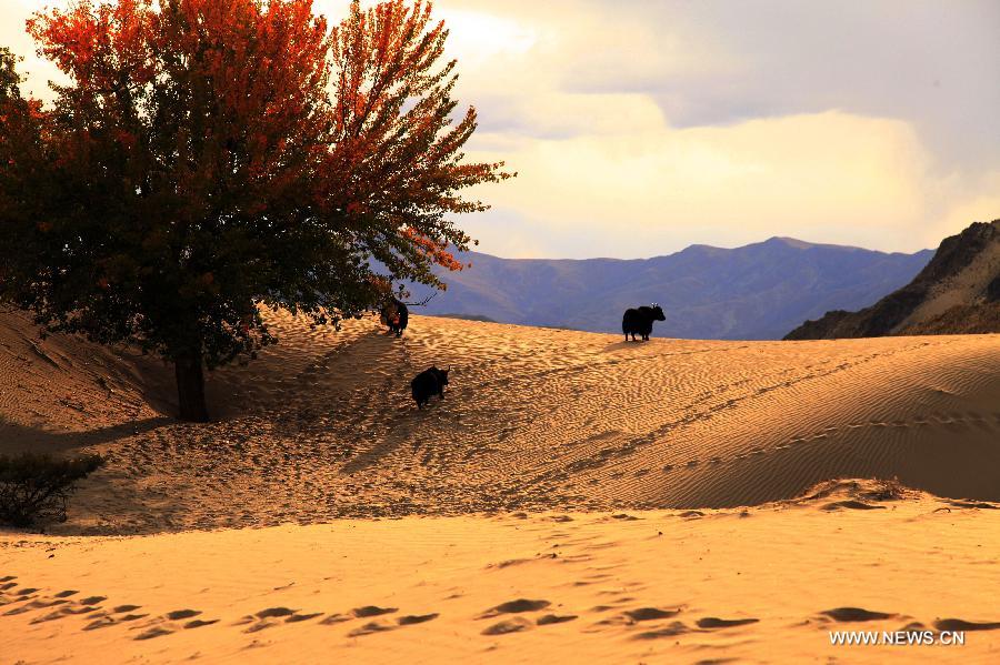 Foto del 25 de octubre de 2014 muestra a varios yaks caminando por el humedal en el condado de Gonggar, región autónoma del Tíbet.
