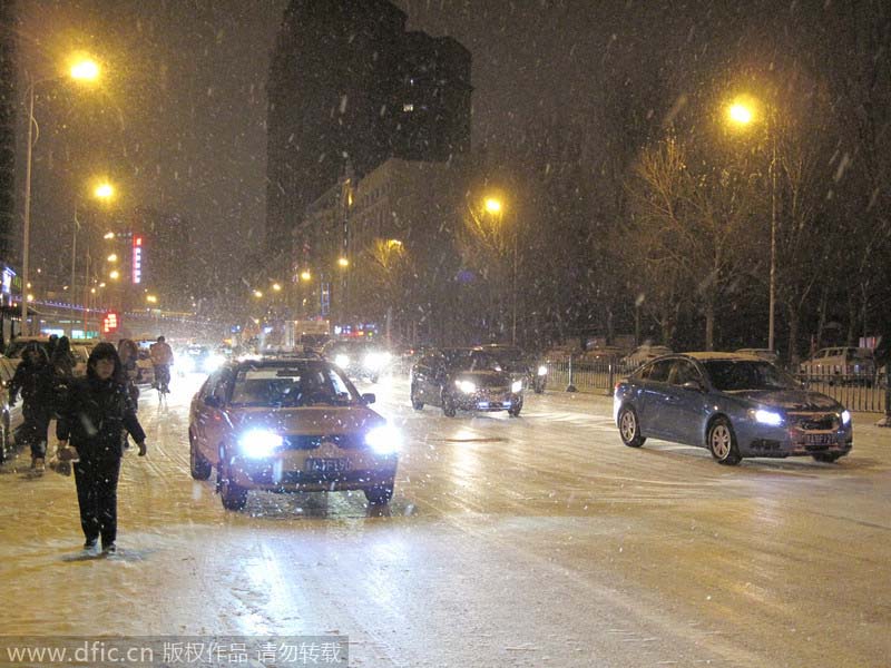 Harbin,13/11/2014(El Pueblo en Línea)-Coches en una carretera en medio durante una nevada en la provincia de Harbin, Heilongjiang, el 12 de noviembre de 2014. Debido a la nevada repentina que azotó el norte de China, seguramente la niebla que ha cubierto esta región del país durante semanas desaparecerá. [Foto/IC]