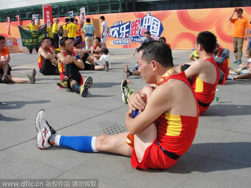 Los participantes calientan antes de correr los 10 kilómetros de felicidad. [Foto: IC]