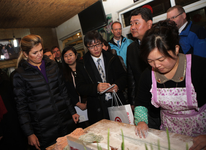 Wang ense?a a la reina Máxima de Holanda a hacer tallarines chinos su restaurante durante un viaje de la reina a una zona financiera en la aldea de Dongxingtun, a las afueras de Pekín, el 26 de noviembre de 2014. [Foto/CFP]