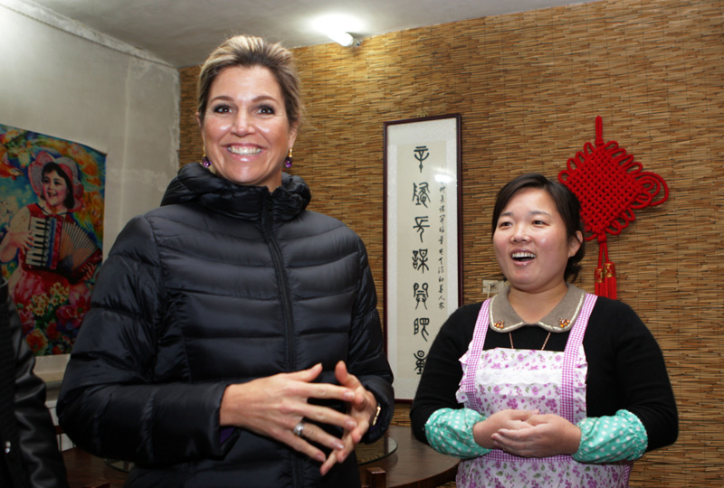 La reina Máxima de Holanda charla con la aldeana Wang Yan al llegar a su restaurante durante un viaje a una zona financiera en la aldea de Dongxingtun, a las afueras de Pekín, el 26 de noviembre de 2014. [Foto/CFP]