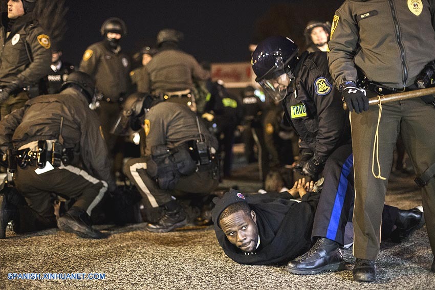 FERGUSON, Estados Unidos, 29 nov (Xinhua) -- La policía arrestó anoche a 15 personas cuando alrededor de 100 manifestantes bloquearon el tránsito frente al departamento de la policía local en Ferguson.