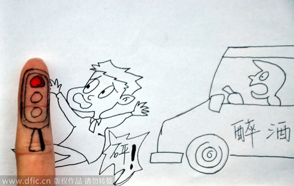 La obra “El precio de conducir borracho”, que intenta concienciar sobre la seguridad vial y la conducción segura, fue hecha por estudiantes de la Universidad de Liaocheng, provincia de Shandong, el 4 dic. Hoy se celebra el primer Día de la Constitución en China. Diez estudiantes de la universidad crearon obras utilizando sus dedos para promover el Estado de Derecho. [Foto / IC]