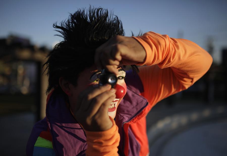 Un payaso salvadore?o juega con una cámara de juguete durante las celebraciones del Día Nacional del Payaso en la Plaza de Beethoven, en San Salvador, el 3 de diciembre de 2014. El congreso salvadore?o declaró el segundo miércoles de diciembre como el Día Nacional del Payaso en honor a todos los payasos salvadore?os y sus esfuerzos crear diversión en el país, según medios locales.