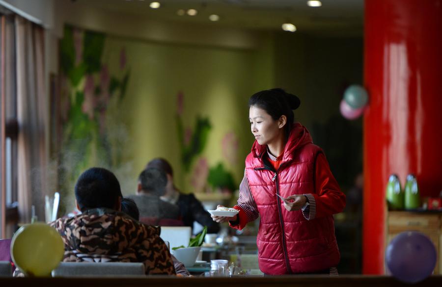 Guo Lishuang, una persona con problemas de audición y habla, asiste a clientes en un restaurante de estofado en la ciudad de Shenyang, capital de la provincia de Liaoning, el 3 de diciembre de 2014. Este restaurante contrató a 42 personas con discapacidad de audición y habla en Shenyang.