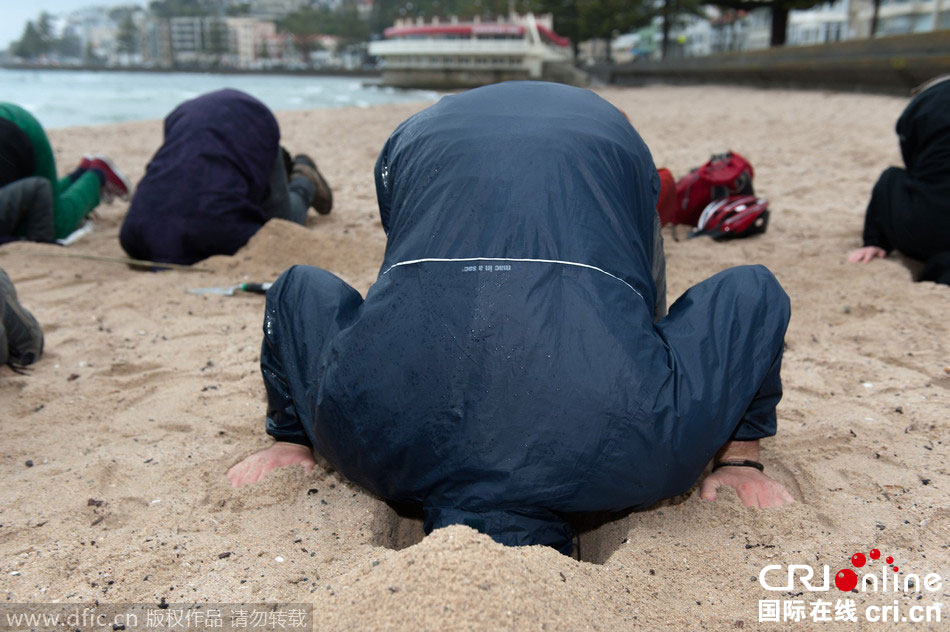 Neozelandés mete la cabeza bajo la arena en protesta por la inacción del gobierno frente al cambio climático (3)