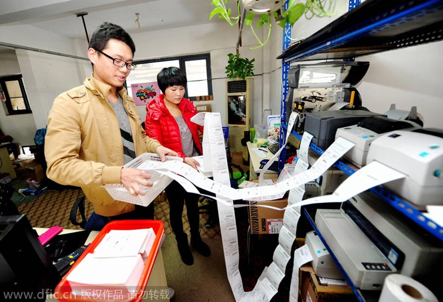 Empleados de una tienda en línea procesan las órdenes del "Día del Soltero" en Luoyang, provincia de Henan. [Foto: IC]