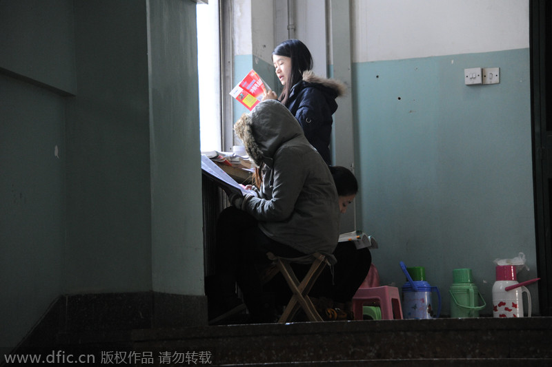 Los estudiantes de la Universidad Normal de Shandong se acercan a la recta final en el período de preparación para el examen nacional de ingreso a cursos de postgrado. Debido a los numerosos candidatos y la capacidad limitada de las aulas, algunos tienen que estudiar en los pasillos y escaleras, a pesar del frío. [Foto: IC]