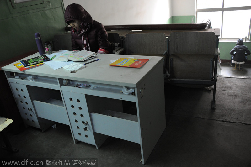 Shandong,09/12/2014(El Pueblo en Línea)-Los estudiantes de la Universidad Normal de Shandong se acercan a la recta final en el período de preparación para el examen nacional de ingreso a cursos de postgrado. Debido a los numerosos candidatos y la capacidad limitada de las aulas, algunos tienen que estudiar en los pasillos y escaleras, a pesar del frío. [Foto: IC]