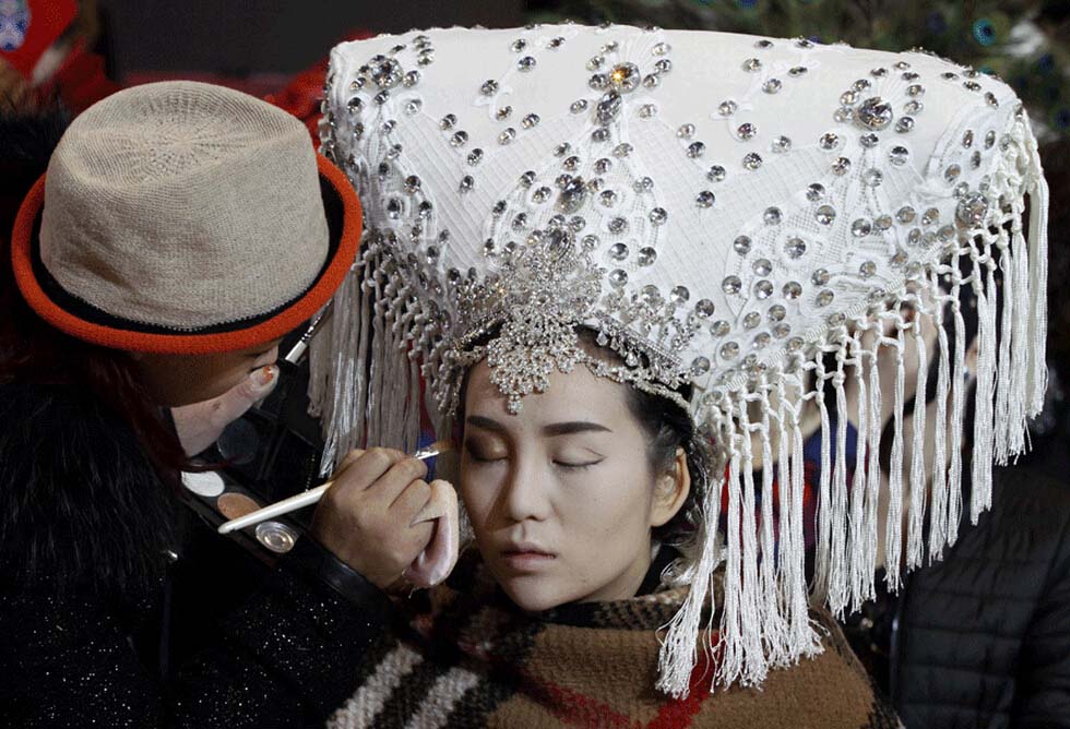 Nanjing, Jiangsu,12/12/2014(El Pueblo en Línea)-Un estilista prepara a una modelo en un concurso de maquillaje artístico en Nanjing, Jiansu. Más de 300 artistas del maquillaje participaron en el evento.