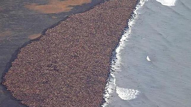 Más de 35.000 morsas se hacinaban en esta playa del norte de Alaska a finales de septiembre. Los investigadores creen que el calentamiento global, que provoca la fusión de los hábitats helados de estos animales en el ártico, está provocando que las morsas cambien su comportamiento, buscando alimentos en la zonas costeras y utilizando las playas para su descanso.