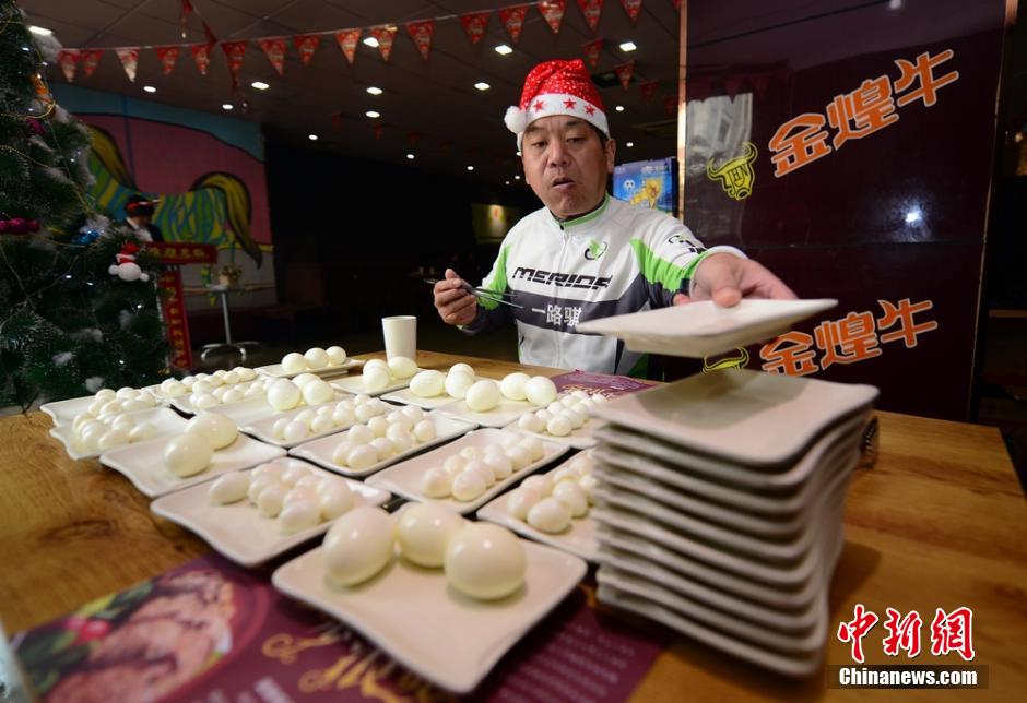 Changsha, 26/12/2014(El Pueblo en Línea)- Bandeja Yizhong, un devorador muy competitivo, participa en un reto de Navidad celebrado en una cafetería de Changsha. El valiente sorprendió al público al comerse 150 huevos de codorniz cocidos y 10 huevos de gallina en tan solo 37 minutos. (foto: CNS/Yang Huafeng)