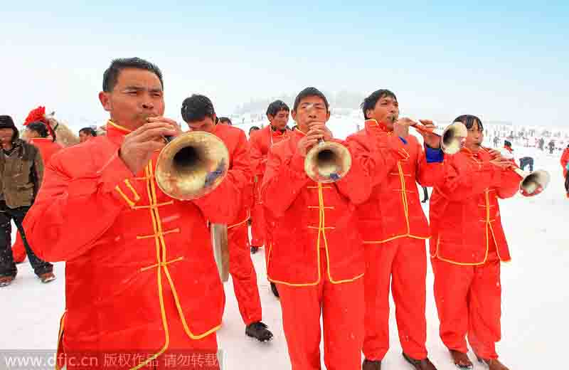 Chongqing, 31/12/2014(El Pueblo en Línea)- El 27 de diciembre comenzó el VI Festival de Hielo y Nieve de la Monta?a Xiannu en Wulong, municipalidad en Chongqing. Noventa y nueve parejas de recién casados, incluyendo extranjeros y parejas de personas mayores celebraron una romántica boda colectiva al estilo Han durante la inauguración del festival. En la celebración se pudieron ver elementos tradicionales de las bodas de estilo Han como pueden ser los trajes de seda roja, las diademas y túnicas de Phoenix y un hermoso paisaje cubierto de nieve. La boda colectiva de este a?o podría formar parte del libro Guinness de los récords. [Foto/IC]