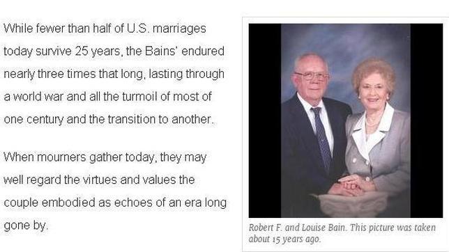 Robert y Louise Bain tuvieron un final acorde a una vida en la que, desde su adolescencia, nunca dejaron de estar juntos. Se conocieron a comienzos de los 40 en Texas, en un campus eclesiástico, y se casaron poco después, en 1942.