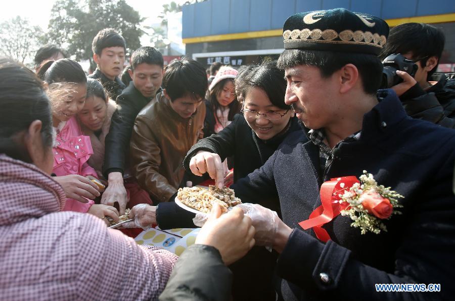 Adil Memettur, Jiang Jinya y Jiang Chunyang confeccionaron un pastel de nuez de 2,6 metros de diámetro y 2015 kilogramos de peso, a consumir gratuitamente por todos con motivo del a?o nuevo. Este joven uygur ha convertido la tradicional merienda de Xinjiang en un floreciente negocio en línea. Changsha, capital de la provincia de Hunan, 03 de enero de 2015.