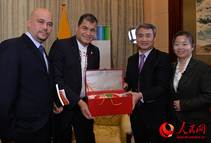 Ecuador es un ejemplo para toda América Latina de la relación con China. Ha sido muy exitosa. China ha sido muy cooperativa, muy amable con nosotros. También nosotros hemos sabido aprovechar eficiente y transparentemente este apoyo, sobre todo financiero. Hay datos que reflejan esta realidad. Al inicio de mi gobierno habían 7 empresas chinas trabajando en Ecuador. Hoy son más de 80, empleando miles de trabajadores. Y china ya es parte de la historia del Ecuador porque con el financiamiento de empresas chinas se están haciendo proyectos estratégicos, históricos, que permitirán cambiar la realidad del país. Por ejemplo, dentro del sector energético. En el 2016 se concluye Coca Codo SinClair, a cargo de la empresa china Sinohydro con financiamiento del gobierno chino. Es la mayor inversión en la historia del país. Esto nos permitirá en el 2016 tener la matriz eléctrica más amigable con el medio ambiente y más eficiente del mundo. Y nos permitirá incluso exportar energía. Esto es solo un ejemplo de lo que se ha logrado en la cooperación con China. Por eso repito que China ya es parte de la historia de Ecuador.