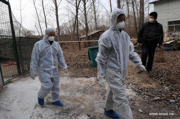 Protectores de animales salvajes usan trajes protectores en la zona del embalse de Sanmenxia del del río Amarillo, en la provincia de Henan, el 17 de enero de 2015.