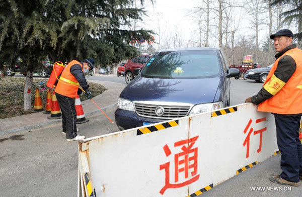 Personal de sanidad fumiga el coche de un ciudadano cerca de la zona del embalse de Sanmenxia del del río Amarillo, en la provincia de Henan, el 17 de enero de 2015.