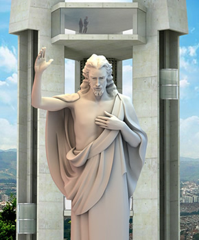 La estatua, ubicada la víspera en el promontorio, tiene un rostro sereno, basado en iconografías clásicas, entre egipcias y persas, no posee corona de espinas y muestra más humanidad porque está descalzo, adicionalmente exhibe parte del torso, el pecho y la espalda mirando al piso, al pueblo, explicó el artista en declaraciones a la prensa.