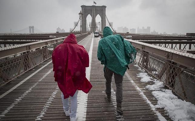 Dos turistas atraviesan el puente de Brooklyn en medio de una tormenta de nieve en Nueva York, Estados Unidos, este lunes