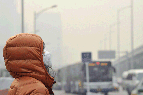 Una mujer con una mascarilla mira hacia el cielo contaminado de Pekín el miércoles. La capital emitió una alerta de contaminación el miércoles. Se espera que la niebla desaparezca ma?ana. [Foto/IC]