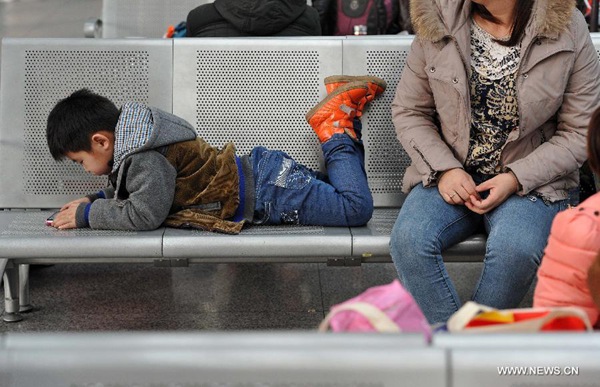 Liu Yuchen, de seis a?os, juega en un banco a la espera del tren que lo llevará a casa en la estación de Yinchuan, capital de región autónoma Hui de Ningxia, el 2 de febrero de 2015.
