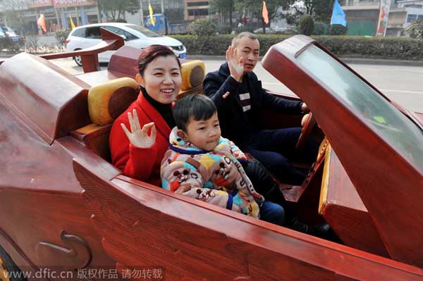 Yu conduce su coche deportivo de madera hecho en casa con su familia en una carretera en el condado de Guangfeng. [Foto/IC]