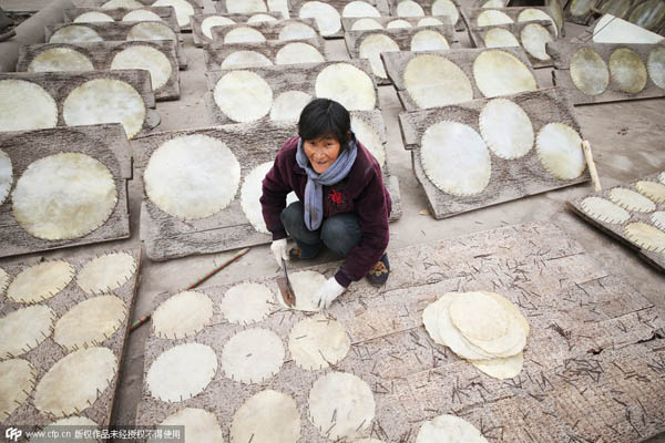 En una fábrica de Yanshi, el experto elige la piel apropiada para cada tambor. El cuero se empapa en agua durante toda una noche para trabajarlo suave y elástico. [Foto: CFP]