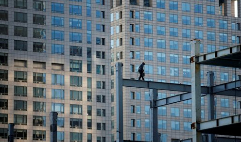 Un trabajador camina sobre una viga durante la construcción de un nuevo centro comercial. Pekín. (Foto: CFP)