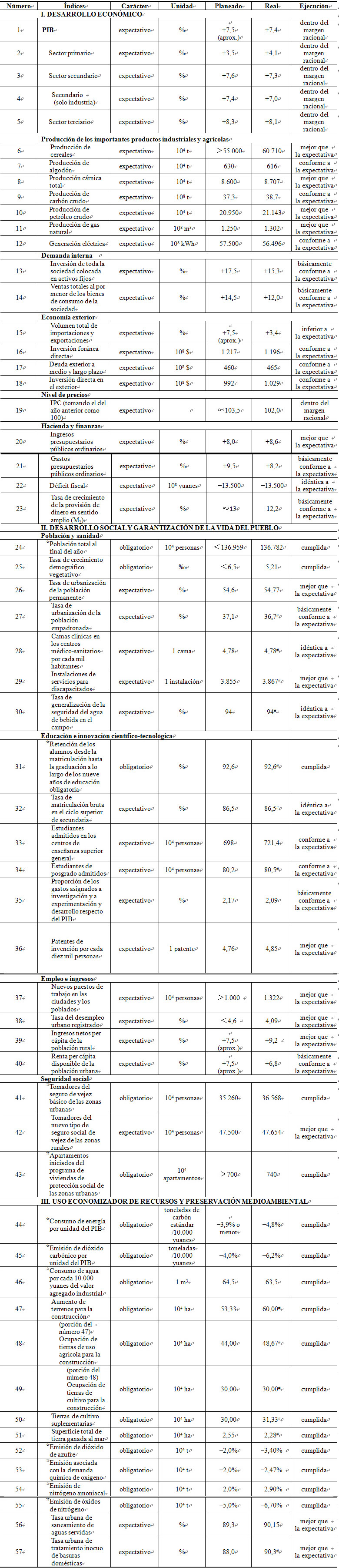 Nota 2. Puesto que las metas planeadas de los índices de carácter expectativo no son valores pronosticados, sino metas de desarrollo esperadas por el Estado, que encarnan la orientación de las políticas y revisten el significado de guiar a los sujetos del mercado, el resultado real de la ejecución puede ser un poco superior o un poco inferior. Las metas planeadas de los índices de carácter obligatorio encarnan el compromiso del Gobierno ante la sociedad, por lo que son de necesario cumplimiento.