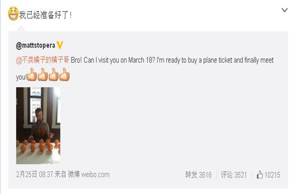 "Estoy listo", le dijo “Hermano Naranja” a @mattstopera en Weibo cuando el estadounidense dijo que iba a volar a China.