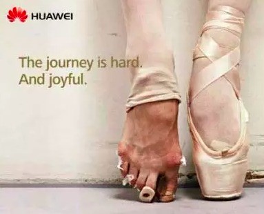 Esta es la imagen utilizada por Huawei para su publicidad. Su fundador, Ren Zhengfei explicó el significado del anuncio en el Foro de Davos el 22 de enero de 2015. "Esta es la imagen exacta de la vida en Huawei, es dolorosa y difícil, pero también alegre y feliz. Huawei es como los pies. Si no los ense?amos, todo el mundo creerá que los pies están bien".