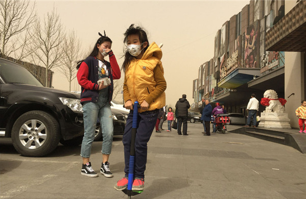 Una ni?a juega con una mascarilla puesta en Pekín, el 28 de marzo de 2015.