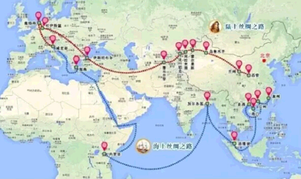 La Ruta de la Seda Marítima moderna une a China con el sudeste asiático, Oriente Medio, áfrica oriental y algunas naciones europeas mediante rutas marítimas de vital importancia como el estrecho de Malaca y el mar Rojo.