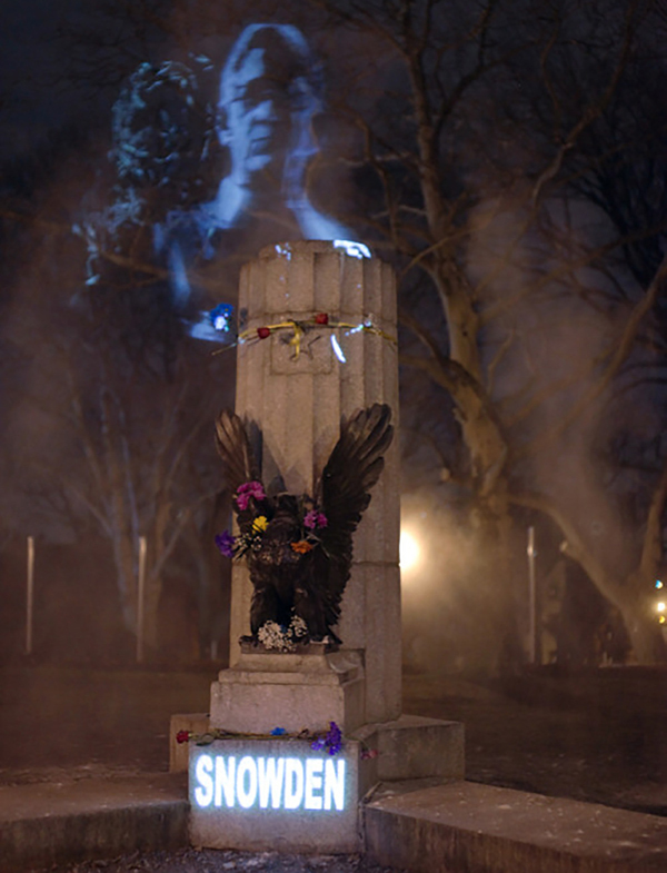 Los artistas pertenecen a un colectivo llamado “The Illuminator” y no están relacionados con la escultura original, sin embargo se les ocurrió usar laptops y proyectores para que la imagen de Snowden pudiera aparecer flotando sobre el punto donde el busto había sido colocado.