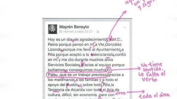 Valencia,16/04/2015(El Pueblo en Línea)-La carta de despedida de la concejala de Cultura en el Ayuntamiento de Valencia y presidenta del Palau de la Música, Mayrén Beneyto, que publicó en su perfil de la red social Facebook para anunciar que dejaba la política, presenta unas 30 faltas de ortografía y de puntuación, informa 'El Periódico'.