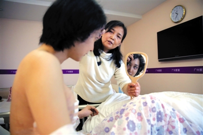 5 de marzo de 2015. Mientras que Liu Ting se recupera de la cirugía de aumento de pecho, su madre le acerca un espejo. (Foto/Beijing News) |